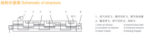 物料由加料器均勻地鋪在網(wǎng)帶上,網(wǎng)帶一般采用12-60目不銹鋼絲網(wǎng),由傳動(dòng)裝置拖動(dòng)在干燥機(jī)內(nèi)移動(dòng)。干燥機(jī)由若干單元組成,每一單元熱風(fēng)獨(dú)立循環(huán),部分尾氣由專門排濕風(fēng)機(jī)排出,廢氣由調(diào)節(jié)閥控制,熱氣由下往上或由上往下穿過鋪滿物料的網(wǎng)帶完成熱量與質(zhì)量傳遞的進(jìn)程,帶走物料水份。網(wǎng)帶緩慢移動(dòng),運(yùn)行速度可根據(jù)物料溫度自由調(diào)節(jié),干燥后的成品連續(xù)落入收料器中。上下循環(huán)單元根據(jù)用戶需要可靈活配備,單元數(shù)量亦可根據(jù)需要選取。